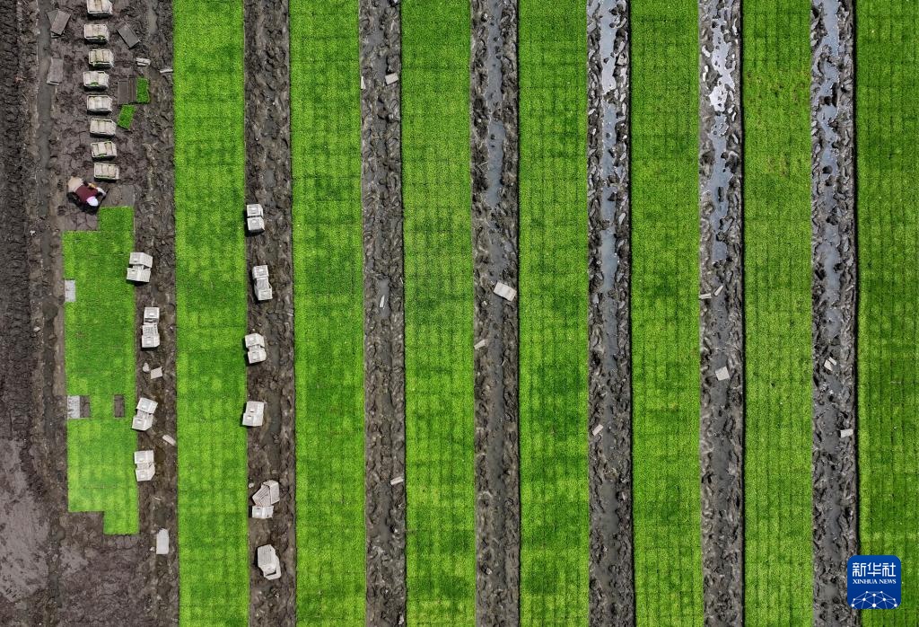 5月17日,河北省唐山市曹妃甸区第八农场的农民在水稻秧苗田起秧(无人机照片)。
