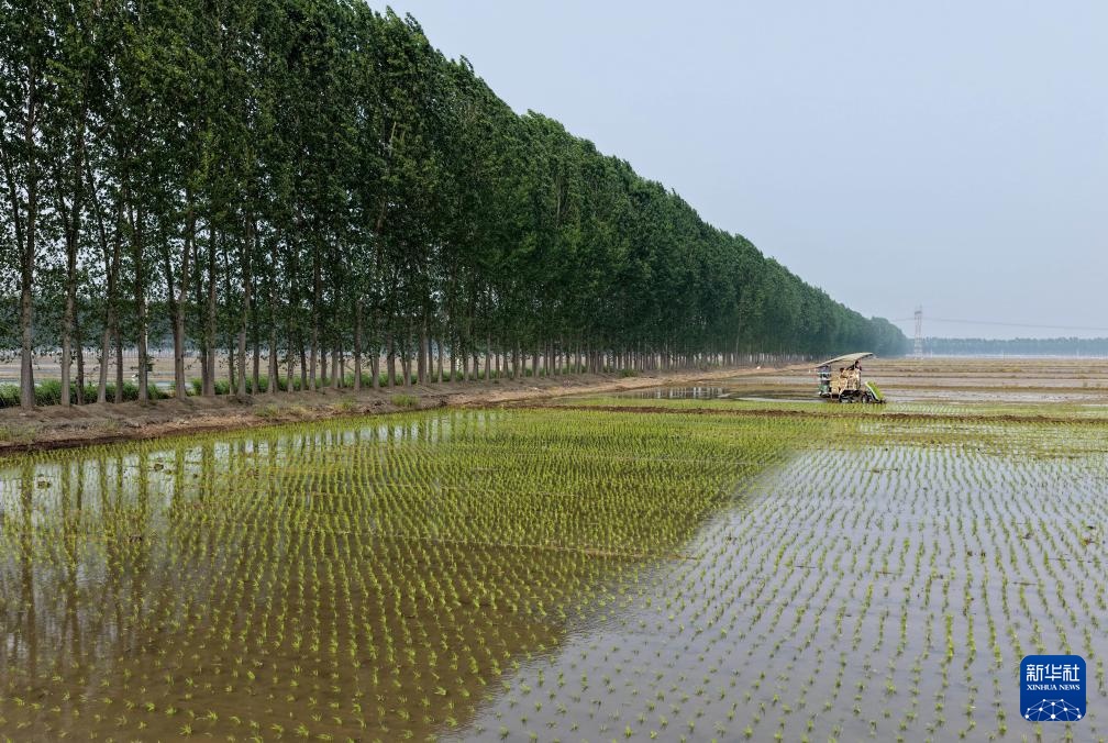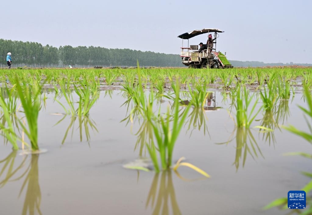 5月17日,河北省唐山市曹妃甸区第八农场的农民在田间使用农机插秧。