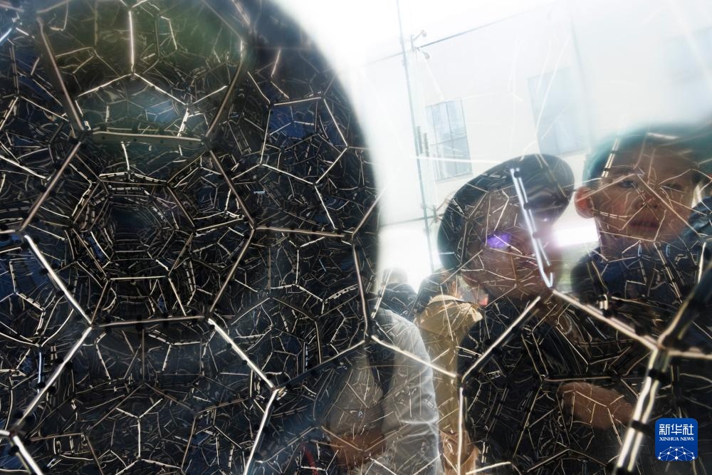 5月17日,在中国科学院数学研究所,参观者在观察阿基米德无穷宇宙展品。