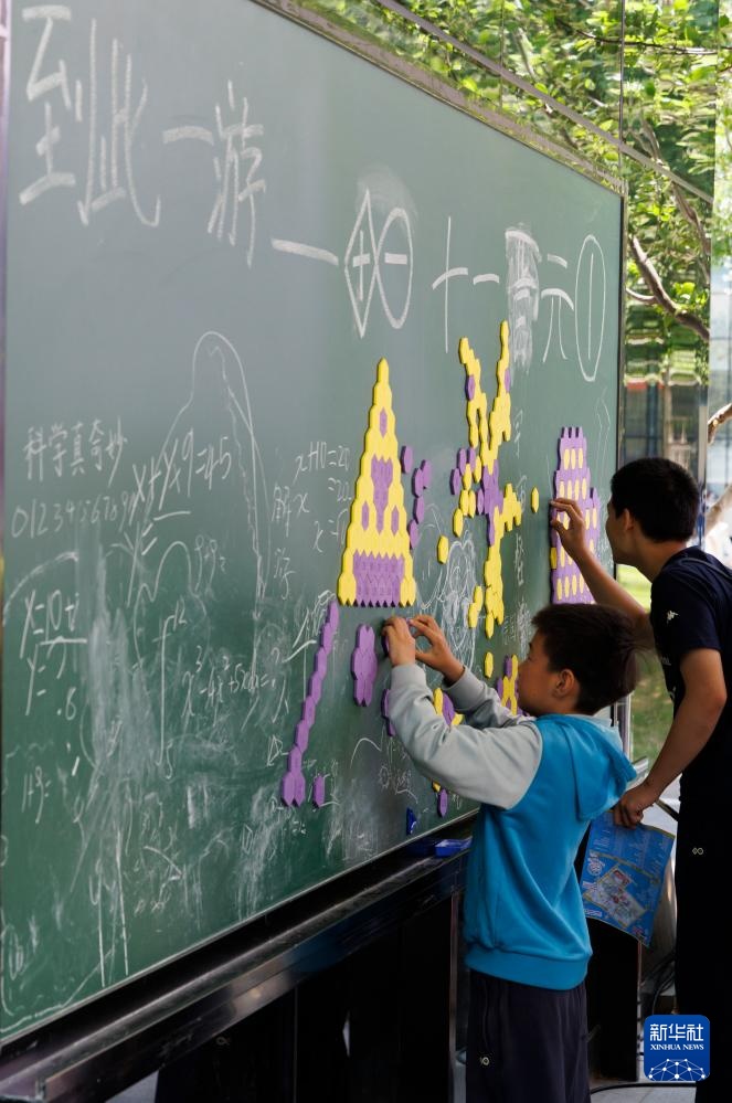 5月17日,在中国科学院数学研究所,参观者在体验数学游戏。