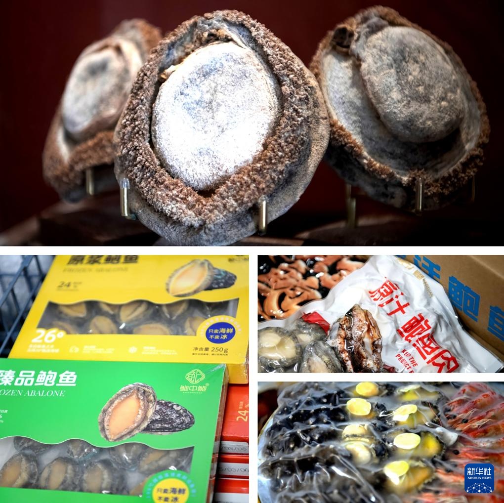 这张拼版照片展示的是鲍鱼出口深加工产品干鲍(上)和部分速冻鲍鱼制品。通过传统美食工艺融合现代食品深加工技术,莆田鲍鱼加工企业推出各种鲍鱼罐头、鲍鱼预制菜肴、鲍鱼肽固体饮料等出口深加工产品(5月16日摄)。