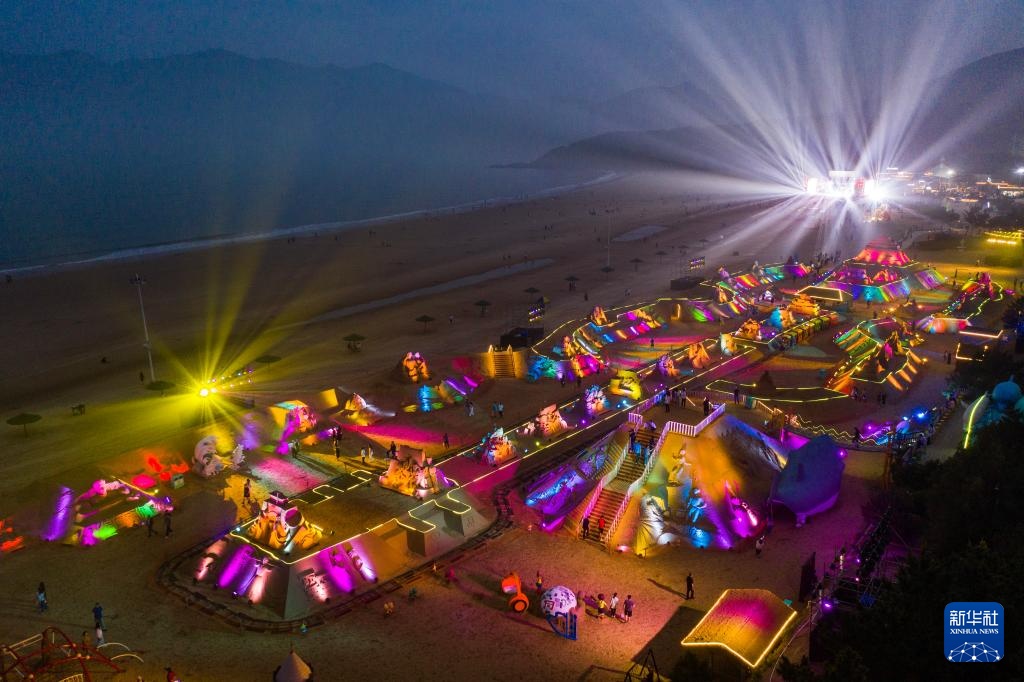 灯光映照下的第二十六届中国舟山国际沙雕节展区(5月17日摄,无人机照片)。