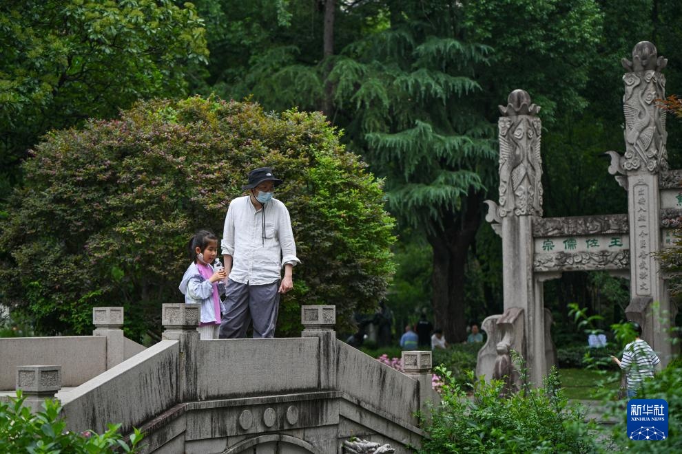 市民在光启公园休息(5月17日摄)。左侧为反映徐光启研究农事的雕塑。