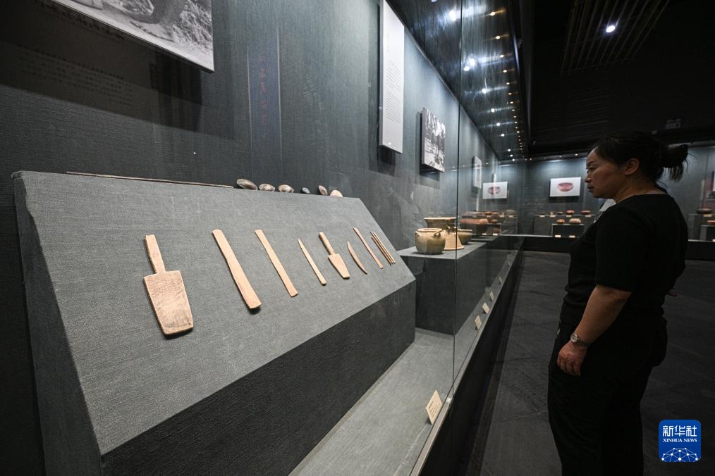 5月16日,游客在位于海南五指山的海南省民族博物馆观看黎族制陶工具。