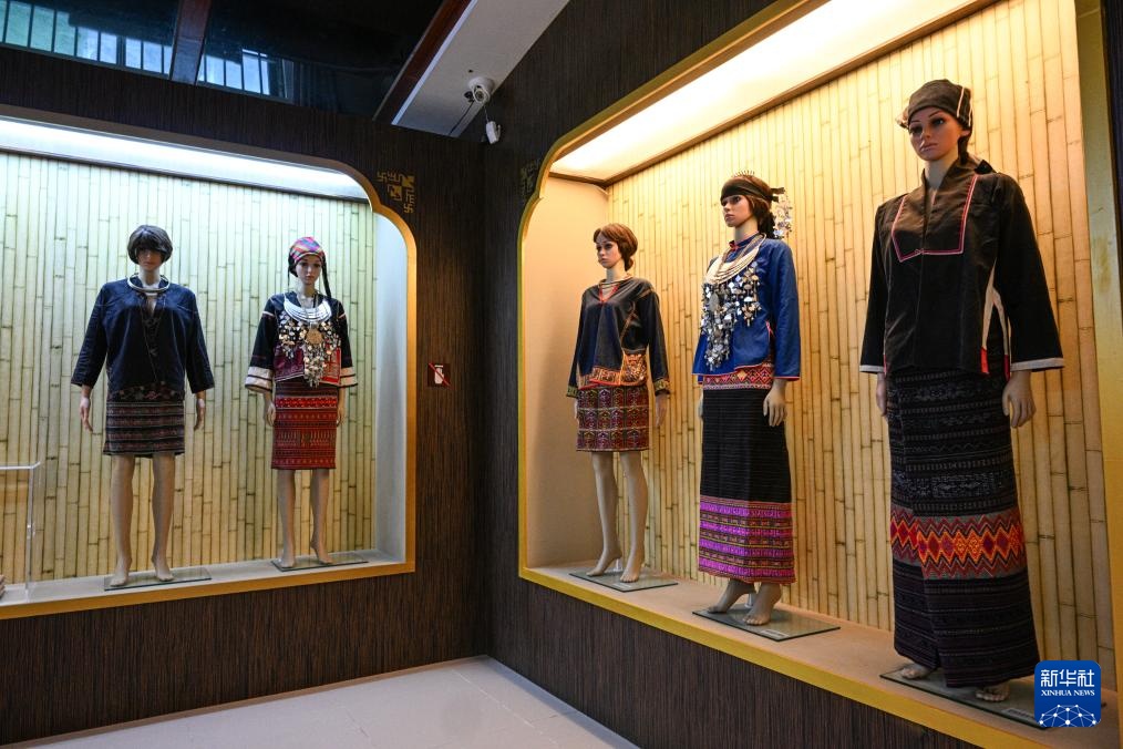 5月12日在位于海南保亭的保亭黎族苗族自治县非物质文化遗产名录陈列馆拍摄的黎族服饰。