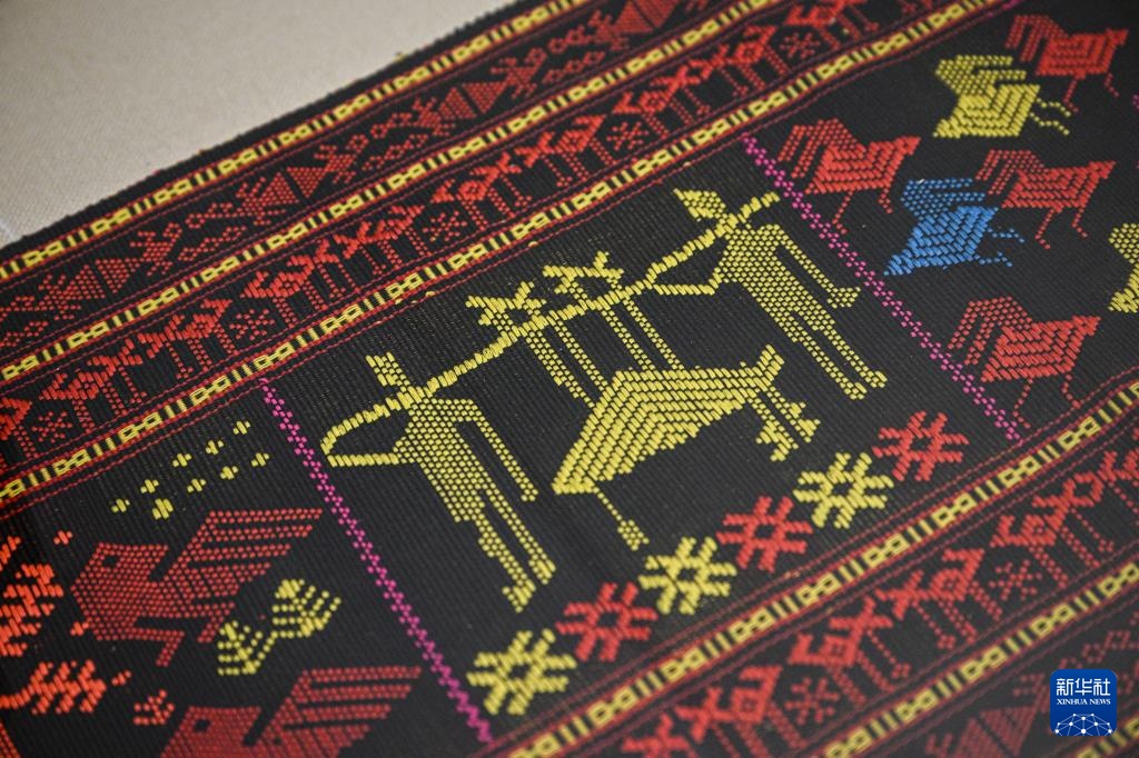 5月12日在位于海南保亭的保亭黎族苗族自治县非物质文化遗产名录陈列馆拍摄的织有黎族生活场景图案的黎锦。