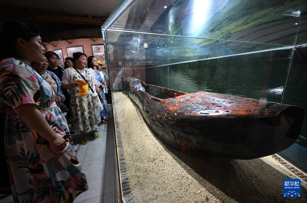 5月15日,游客在位于海南保亭的槟榔谷波隆民俗博物馆观看黎族独木舟。