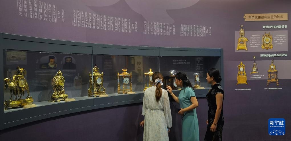 5月17日,游客在船山钟表博物馆内观看18世纪英国为中国清朝宫廷设计制作的“九耀金钟”。