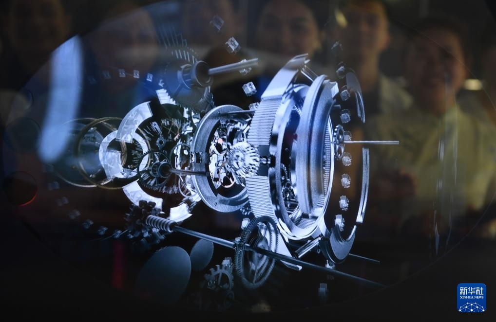 5月17日,游客在船山钟表博物馆内参观用3D全息投影技术展示的手表内部构造。