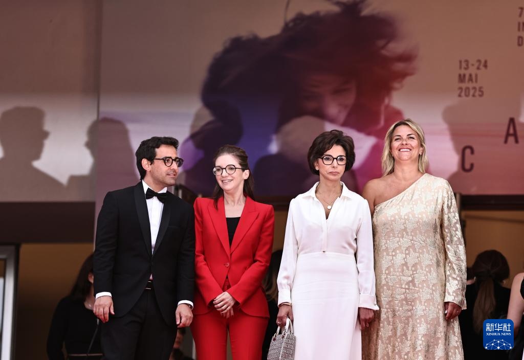 5月17日,在法国戛纳举行的第78届戛纳国际电影节上,主竞赛单元影片《新浪潮》主创人员和法国文化部长达蒂(右二)亮相首映礼。