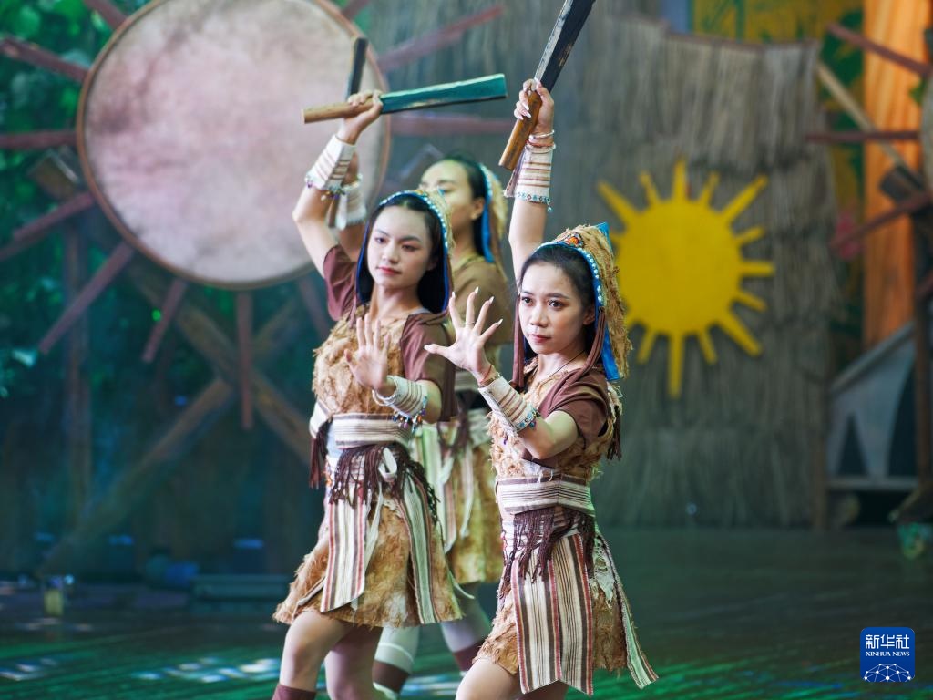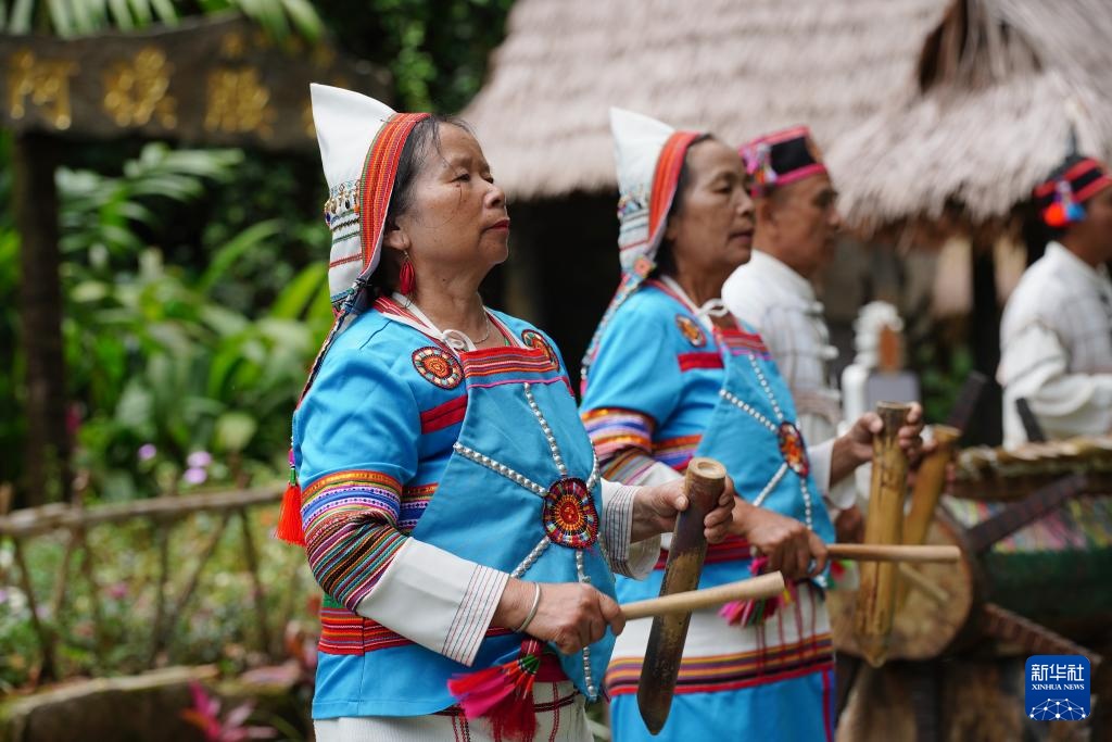 5月16日,演员在基诺山寨景区表演基诺族民间音乐“奇科阿咪”。