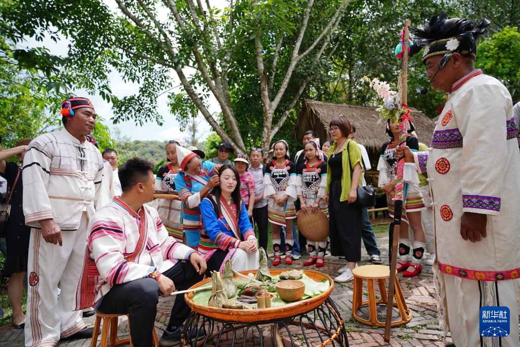 5月16日,游客在基诺山寨景区体验基诺族成人礼。