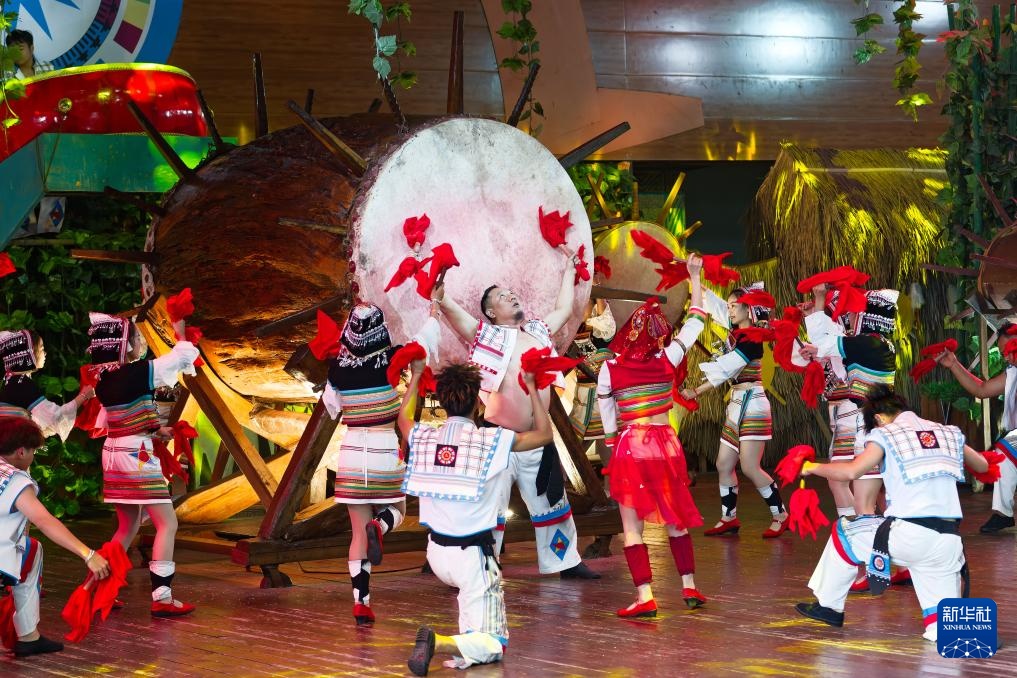 5月16日,演员在基诺山寨景区表演基诺大鼓舞。2006年,基诺大鼓舞被列入第一批国家级非物质文化遗产名录。