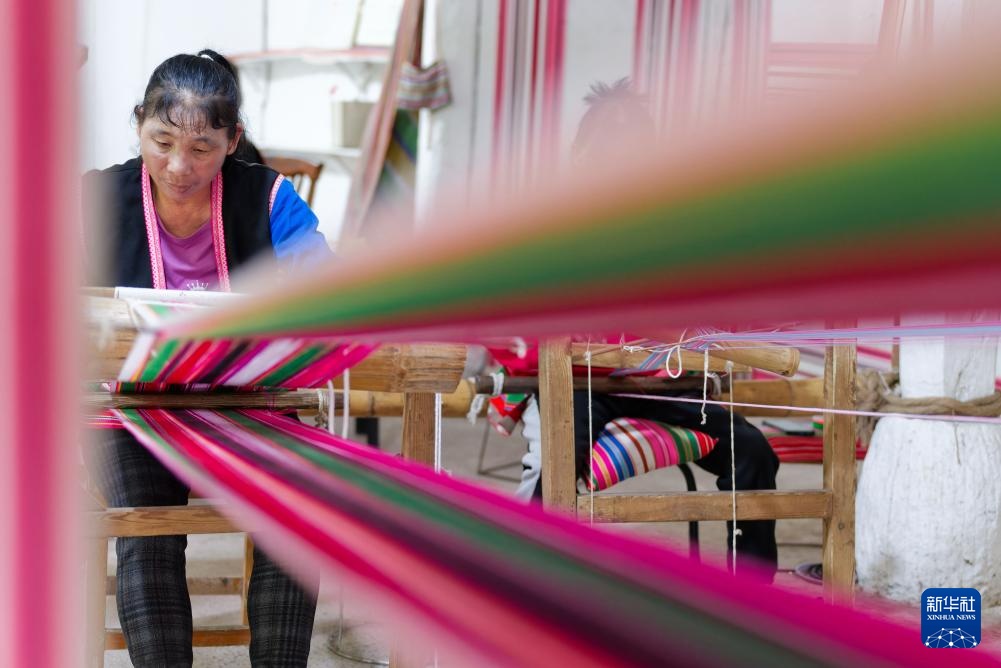 5月16日,妇女在基诺山寨景区展示基诺族砍刀布织布工艺。