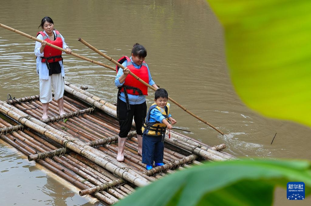 5月17日,在景洪市基诺山基诺族乡,游客在雨林徒步项目体验竹筏划船。