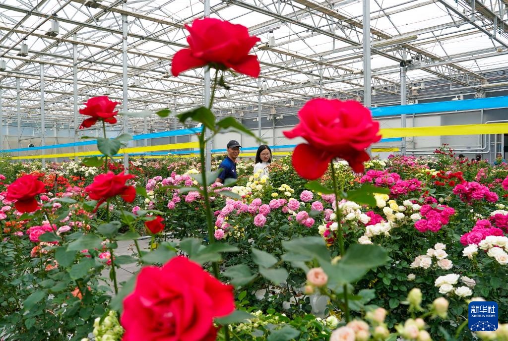 5月18日,参加推荐会的嘉宾在昆明斗南国际花卉技术创新中心大棚内观赏月季新品种。