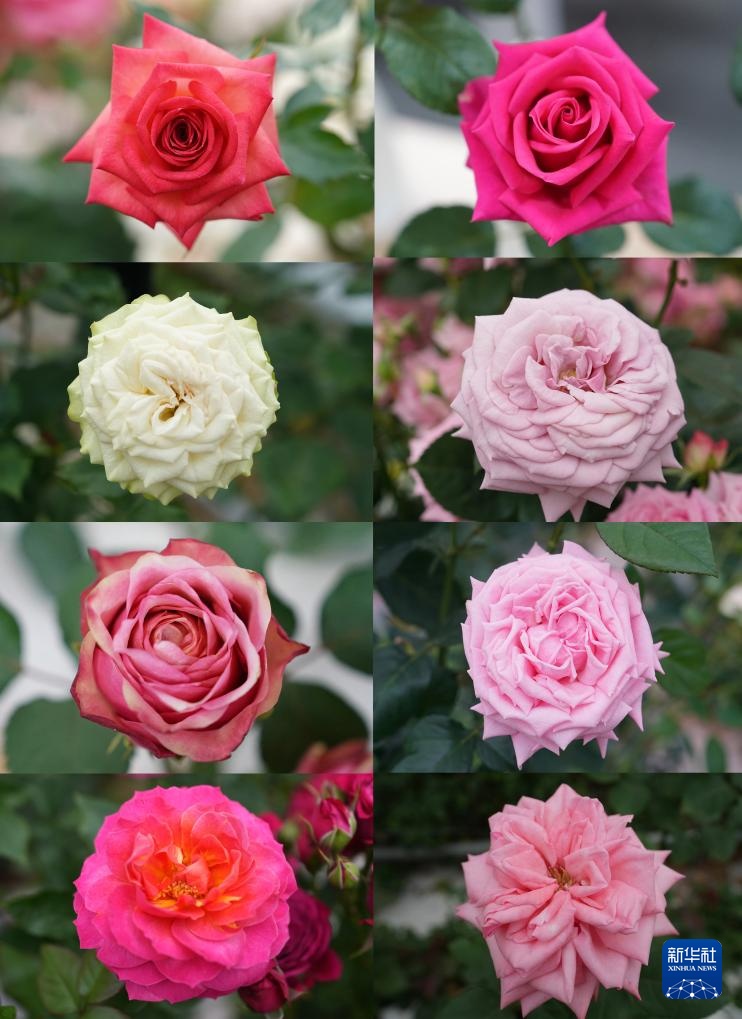 这是5月18日在昆明斗南国际花卉技术创新中心拍摄的部分月季新品种(拼版照片)。