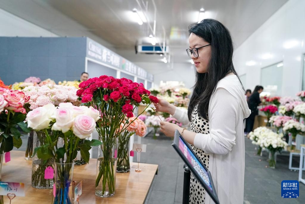 5月18日,参加推荐会的花卉企业工作人员在昆明斗南国际花卉技术创新中心查看瓶插展示的月季新品种。