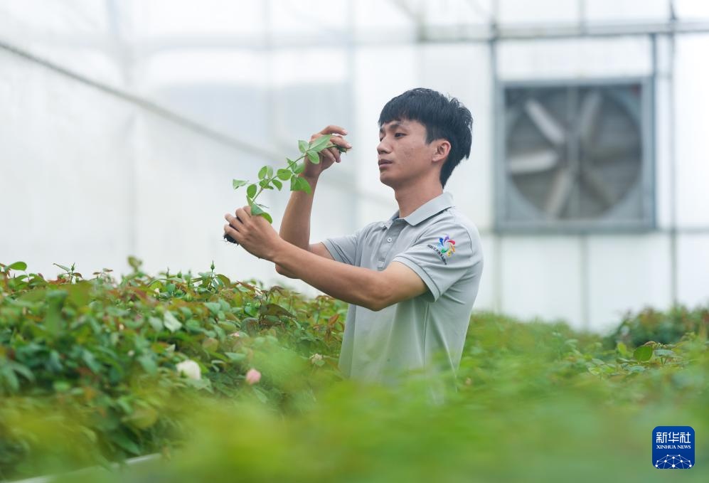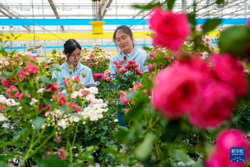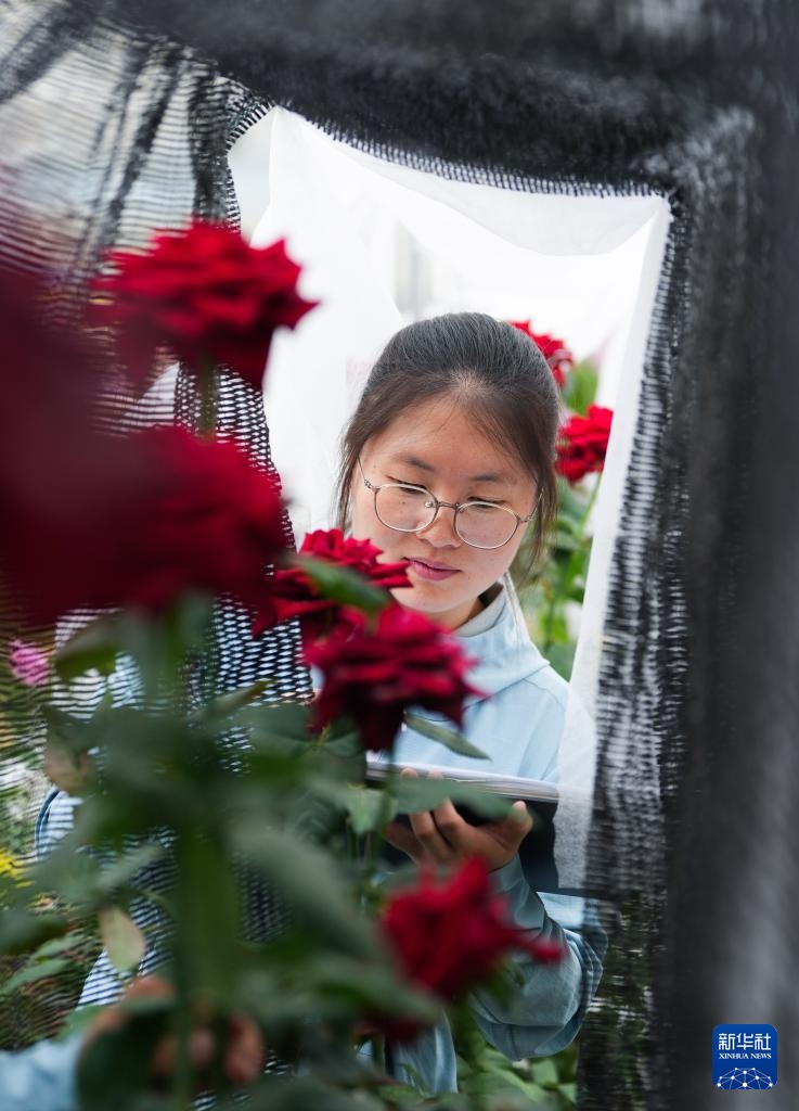5月18日,昆明斗南国际花卉技术创新中心工作人员在查看并记录月季新品种生长情况。
