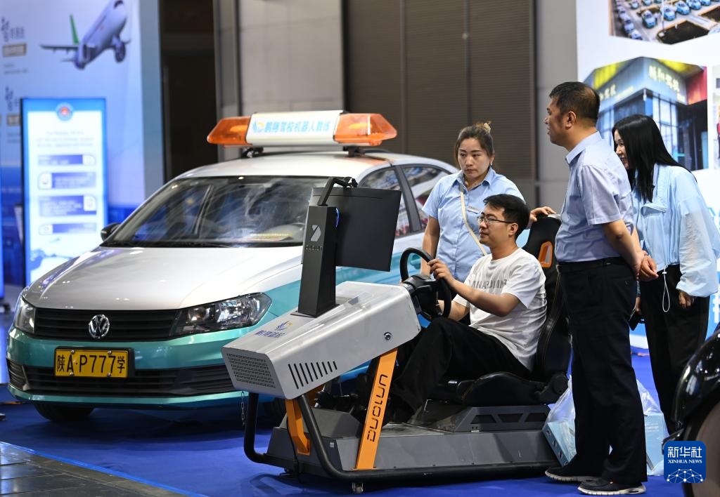 5月21日,在第九届丝绸之路国际博览会暨中国东西部合作与投资贸易洽谈会交通物流展上,参观者体验模拟驾驶。