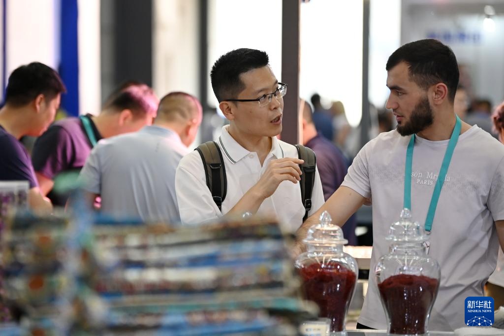 5月21日,在第九届丝绸之路国际博览会暨中国东西部合作与投资贸易洽谈会丝路优品展上,参观者与参展商交流。