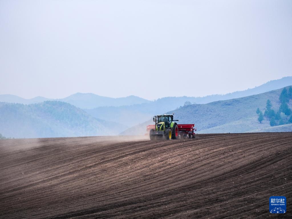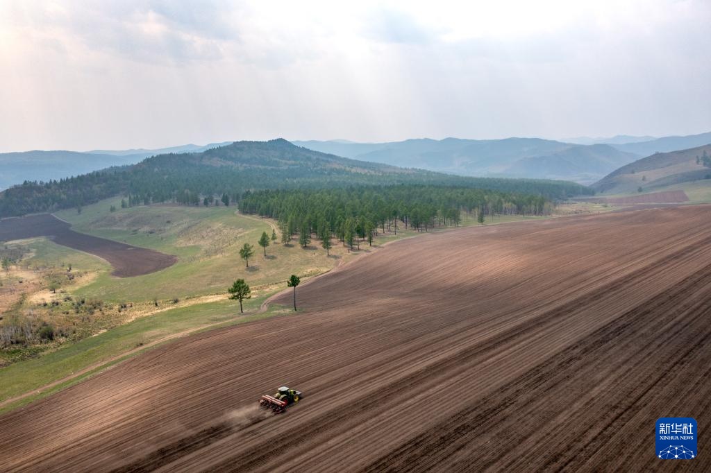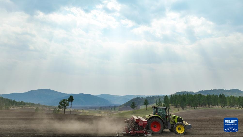 5月21日,在位于扎兰屯市的呼伦贝尔农垦绰尔河农牧场,工作人员驾驶农机播种大豆。