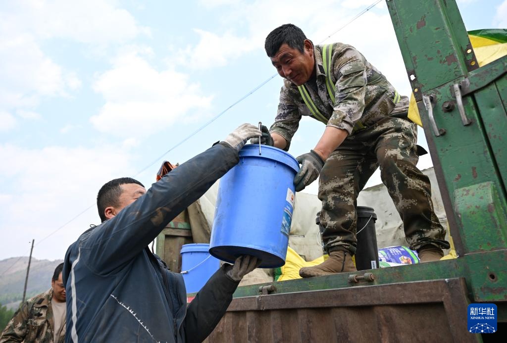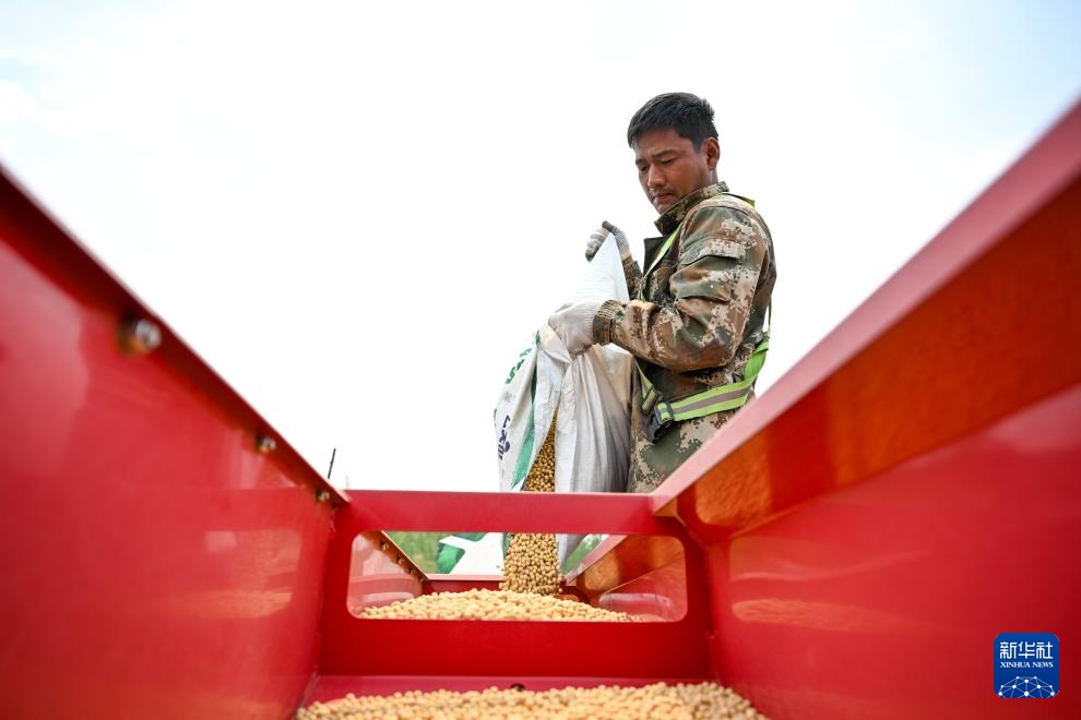 5月21日,在位于扎兰屯市的呼伦贝尔农垦绰尔河农牧场,工作人员向播种机中加入大豆种子。