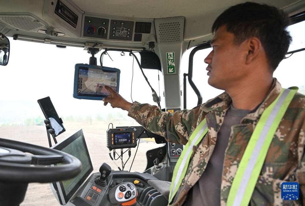 5月21日,在位于扎兰屯市的呼伦贝尔农垦绰尔河农牧场,工作人员在操作农机卫星导航系统。