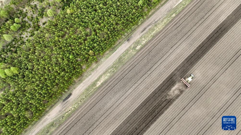 5月21日,在位于扎兰屯市的呼伦贝尔农垦绰尔河农牧场,工作人员驾驶农机播种大豆(无人机照片)。