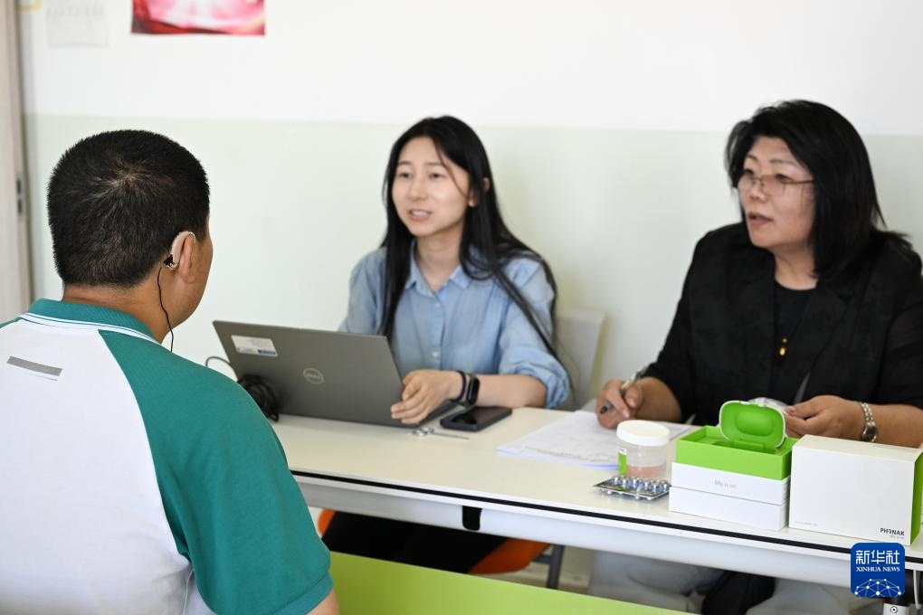 5月21日,在乌鲁木齐市聋人学校,专家为听障学生(左)义诊,并为他适配助听器。