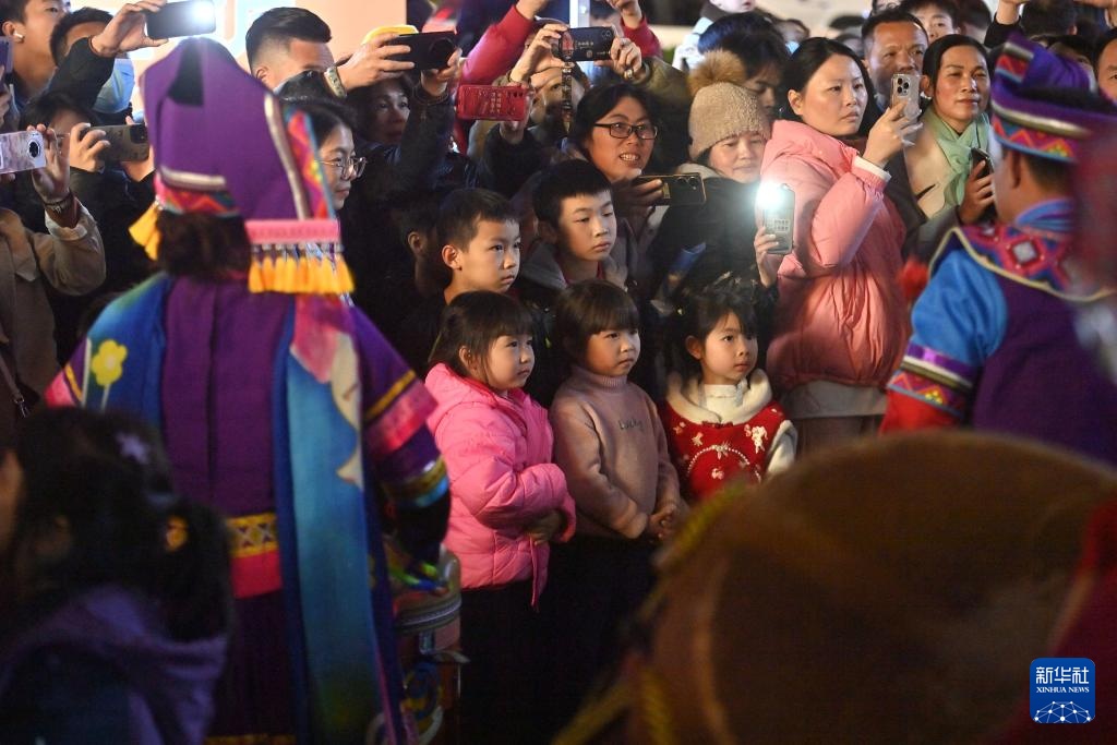 市民和游客在南宁市三街两巷观看民俗表演(3月31日摄)。
