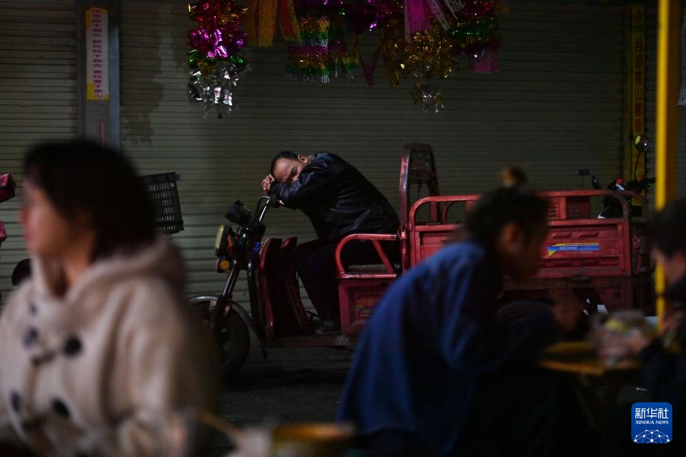 零时许,一位摊主在南宁市西关夜市休息(3月30日摄)。