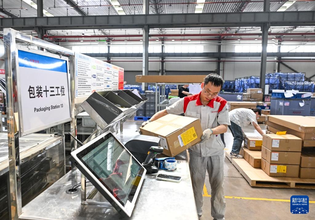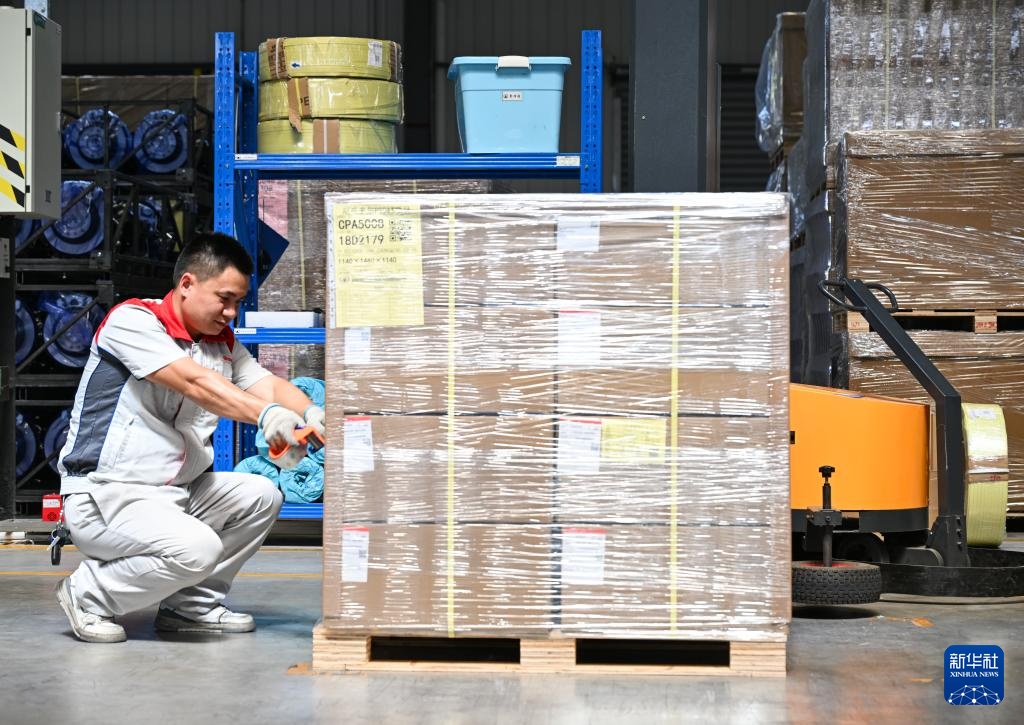 5月21日,在位于重庆永川综合保税区的长城汽车KD工厂,工作人员在打包即将出口的汽车零部件。