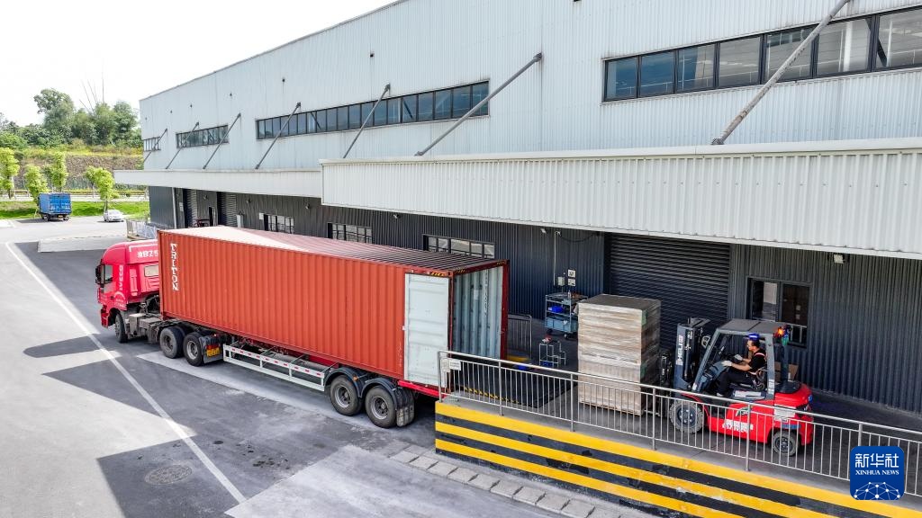 5月21日,工作人员在重庆永川综合保税区装运即将出口的货物。