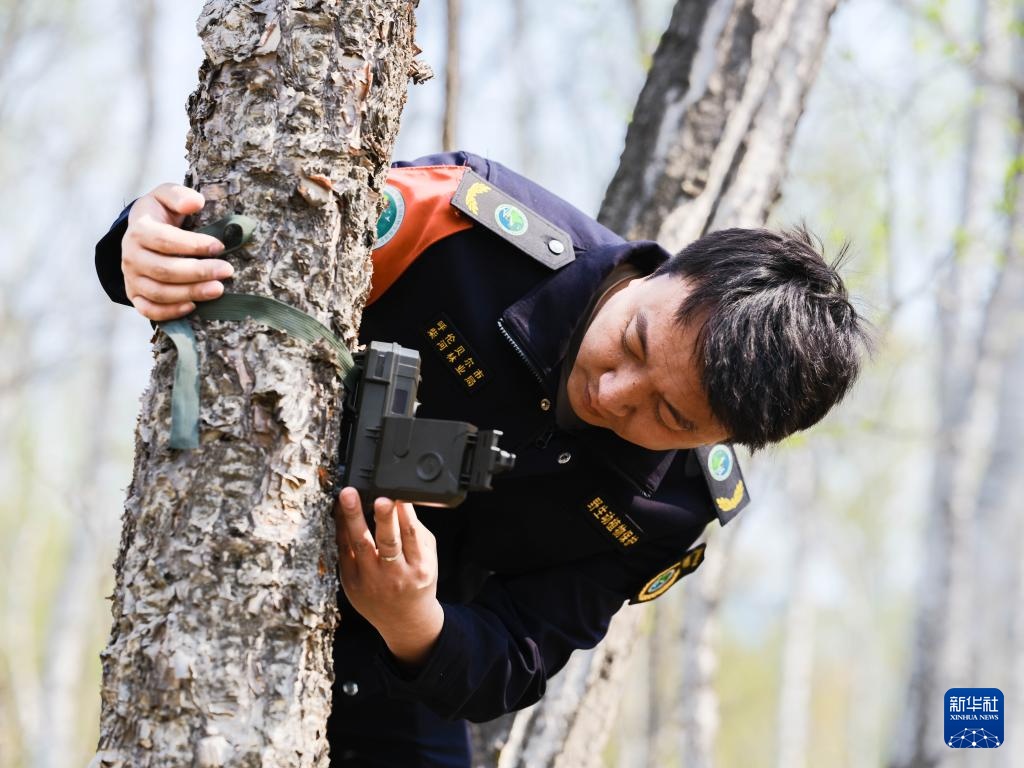 5月21日,护林员衣明哲在内蒙古呼伦贝尔扎兰屯市柴河口林场安装红外相机。