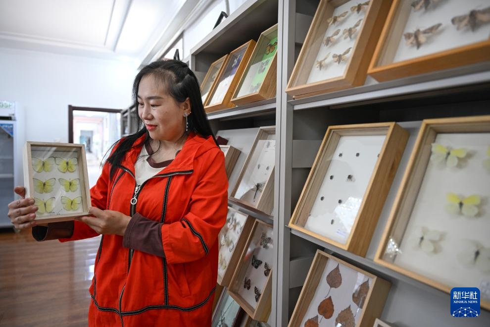5月21日,柴河林业局工作人员张彬在展示当地蝴蝶标本。