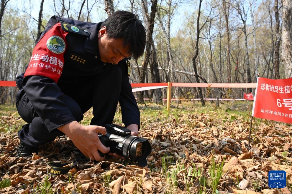 5月21日,在内蒙古呼伦贝尔扎兰屯市柴河口林场,护林员衣明哲对一株野生杜鹃花进行拍摄记录。