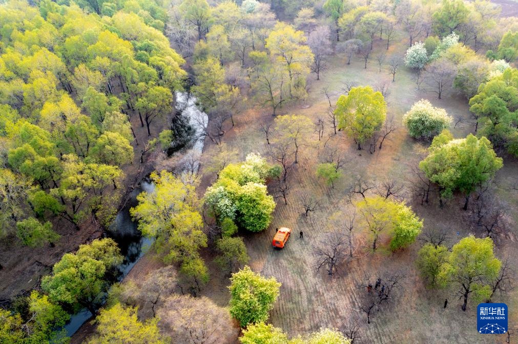 5月20日,护林员在内蒙古呼伦贝尔扎兰屯市白毛沟林场巡护一处国家二级保护植物黄檗的野外栖息地(无人机照片)。
