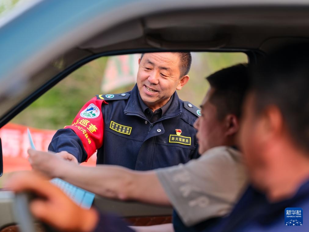 5月20日,在内蒙古呼伦贝尔扎兰屯市白毛沟林场,护林员杨立军对经过的车辆进行野外防火宣传。
