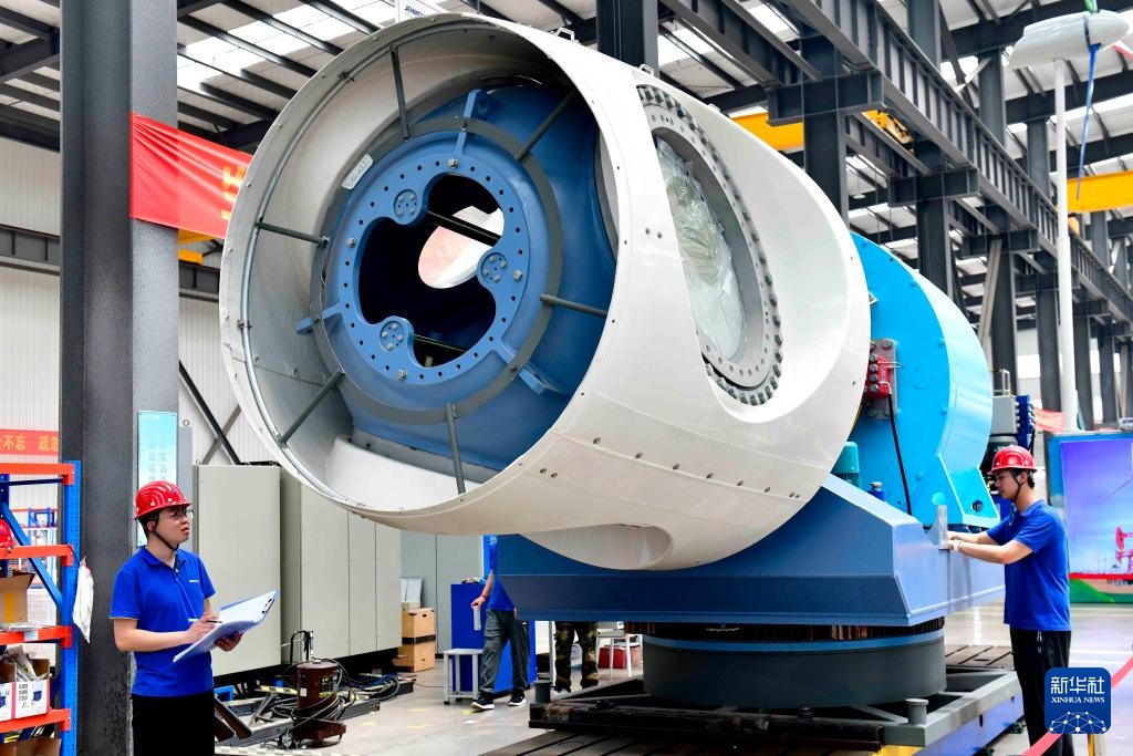 5月20日,三一重能(日照)风电设备制造基地工作人员在风电设备生产车间作业。