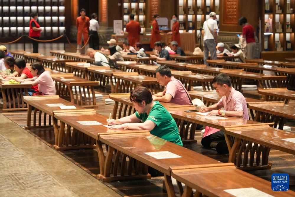 游客在尼山圣境景区仁厅内临摹《论语》(5月21日摄)。