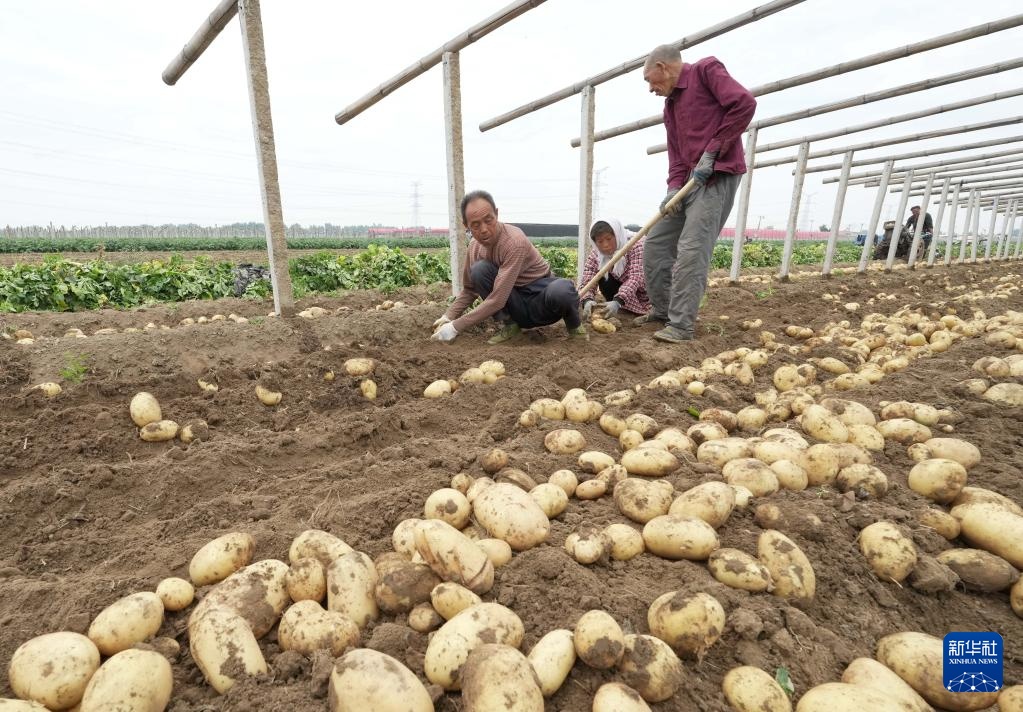 5月23日,昌黎县马坨店乡尹坨村一家马铃薯种植合作社的社员在田间收获马铃薯。