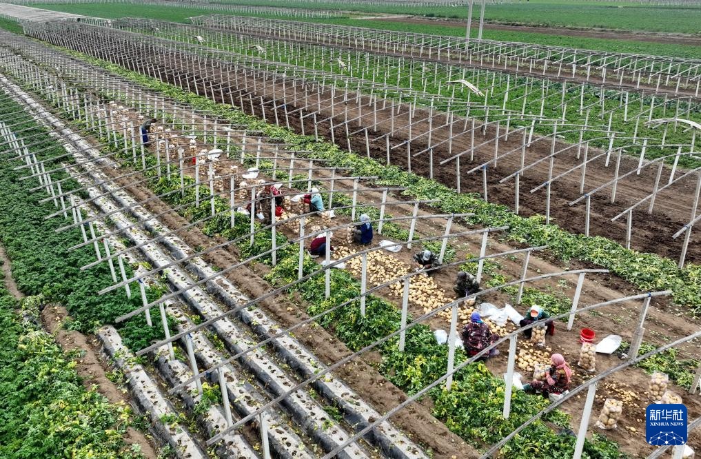 5月23日,昌黎县马坨店乡尹坨村一家马铃薯种植合作社的社员在田间收获马铃薯(无人机照片)。