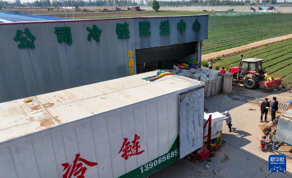 5月23日,工人在位于贺兰县习岗镇的鲜丰农业冷藏库将冷凉蔬菜装车外运(无人机照片)。