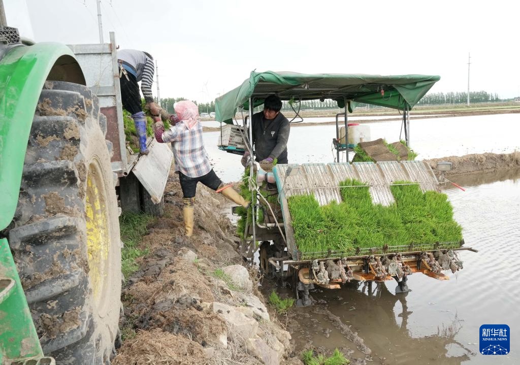 5月23日,秦皇岛市昌黎县刘台庄镇东新立庄村的农民将水稻秧苗搬运到插秧机上,进行插秧。