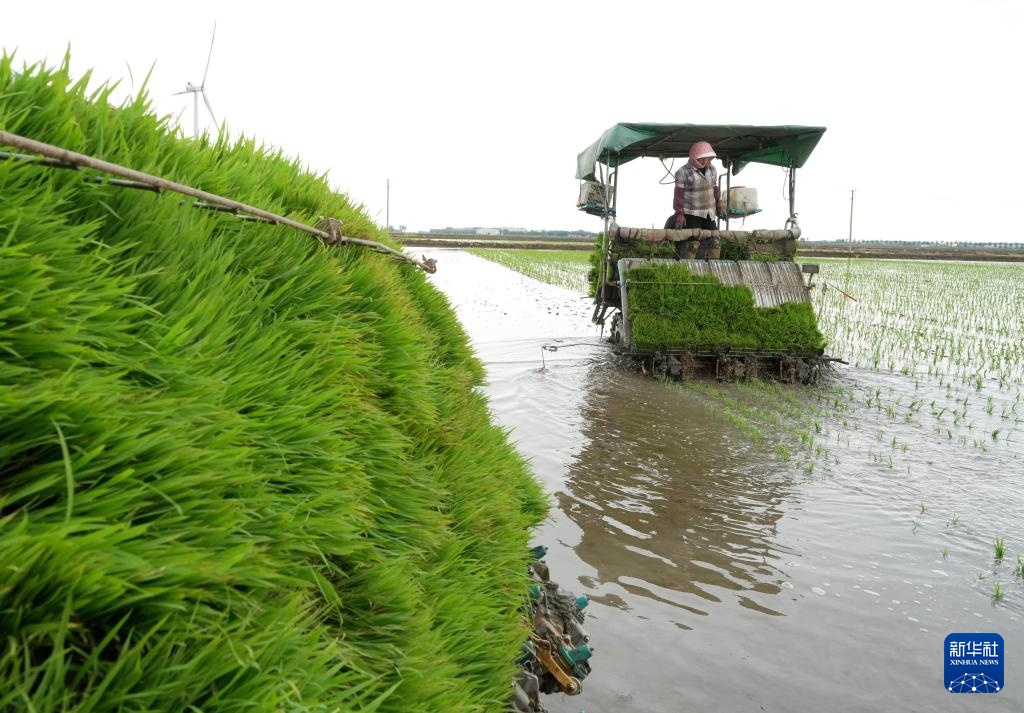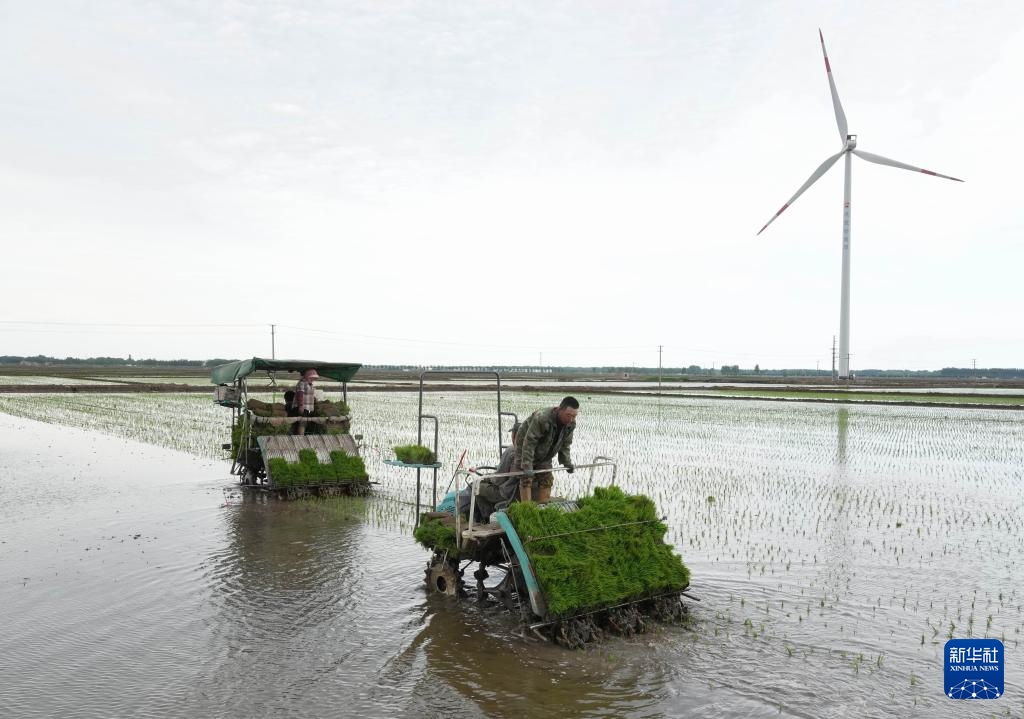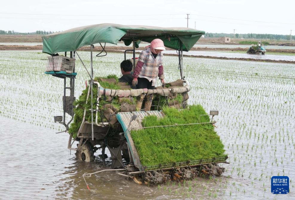 5月23日,秦皇岛市昌黎县刘台庄镇东新立庄村的农民在田间使用农机插秧。