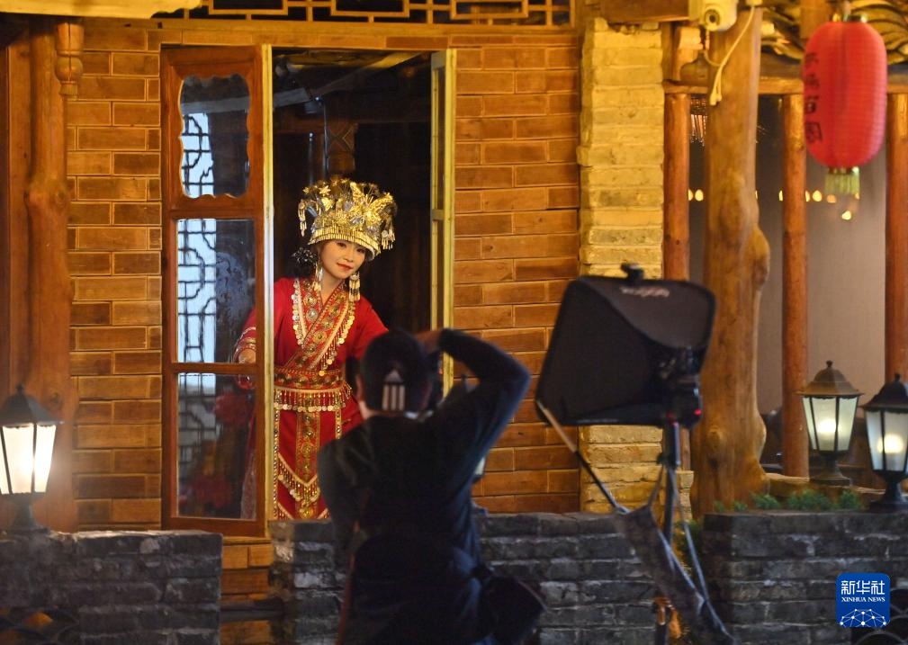 游客在融水苗族自治县双龙沟森林旅游度假区梦呜苗寨拍照(4月15日摄)。