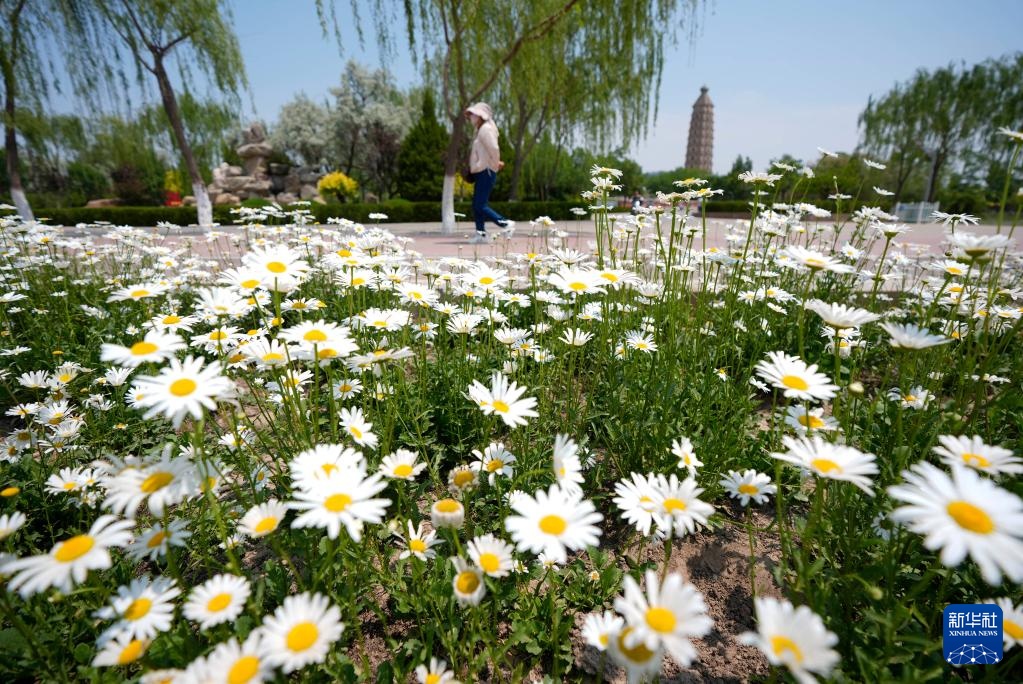 5月25日,游客在宁夏银川市海宝公园游玩、赏花。
