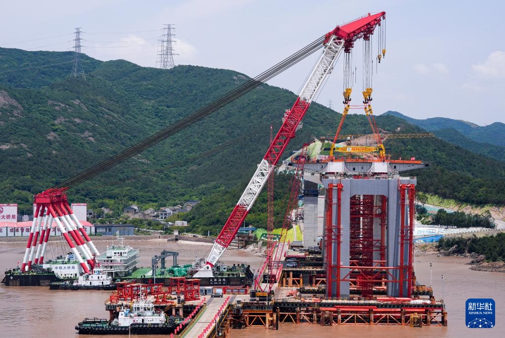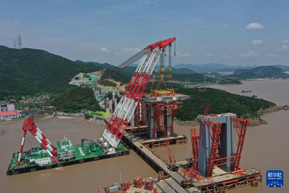 5月27日,在甬舟铁路西堠门公铁两用大桥建设现场,中铁大桥局“大桥海鸥”号起重船将节段钢梁吊装到指定位置。