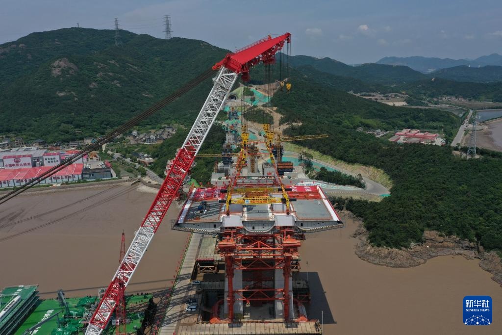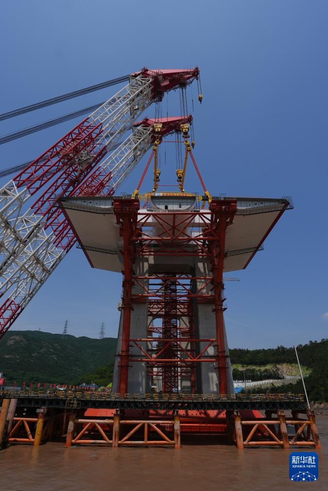 5月27日,在甬舟铁路西堠门公铁两用大桥建设现场,首节钢梁被吊装到指定位置。